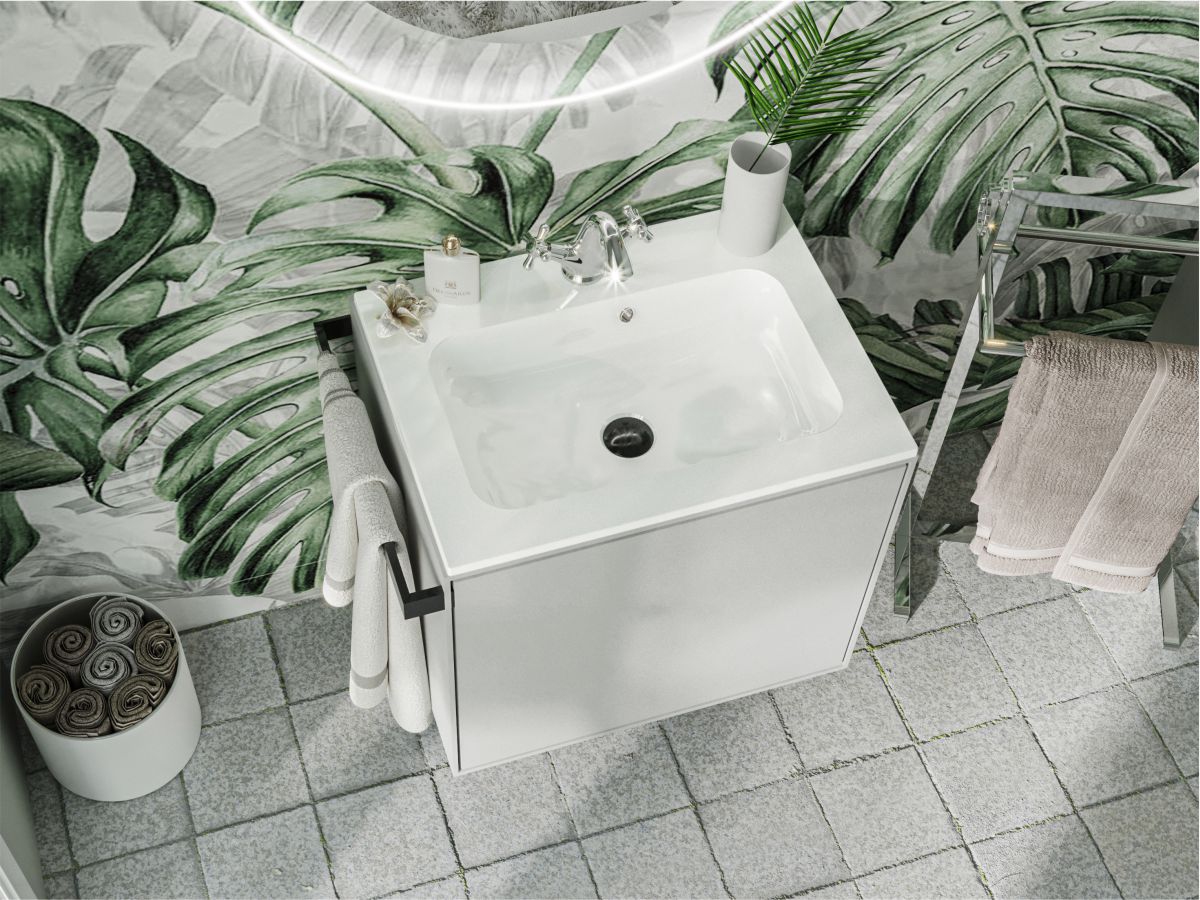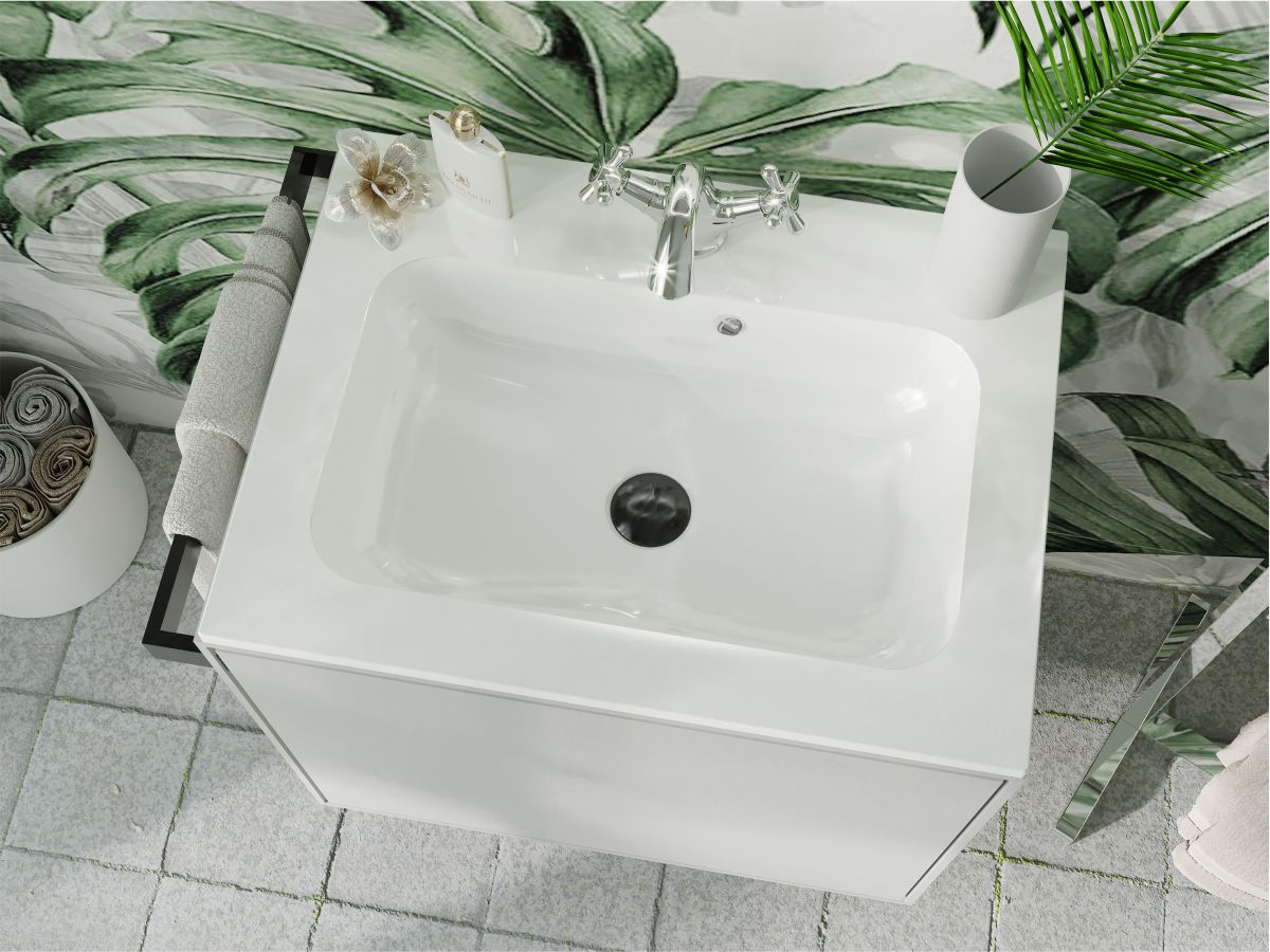 Умывальник DELLA 600 из литого мрамора MIRAGGIO. Литой мрамор — твердый и долговечный материал. Основным компонентом смеси является молотая мраморная крошка, которую смешивают с полиэфирными смолами. Раковина покрывается антибактериальным гелем Gelcoat ISO NPG, который делает изделие прочным и белоснежным.